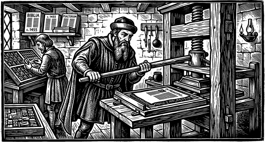 Jako spostrzegawczy człowiek zauważył, że nieraz produkuje się duże ilości identycznych przedmiotów. Na przykład bije się monety, odlewa pociski. Czemuż więc nie drukować setek identycznych stron, które można by potem odpowiednio połączyć w identyczne książki?