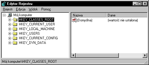 Uwaga: Wszelkie zmiany w Rejestrze czynimy na własną odpowiedzialność. Jeżeli modyfikacje można wprowadzić bez korzystania z Edytora Rejestru, zawsze lepiej uniknąć jego używania -- nie sygnalizuje on jakichkolwiek błędów we wprowadzonych wartościach. Gorąco można polecić Edytor założeń systemowych (CD-ROM Windows 95, folder ADMIN).