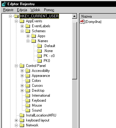 użytkownika. Schemes\Names określa ich czytelne nazwy -- .Default jest tu rozwijane jako "Domyślne dla Windows".