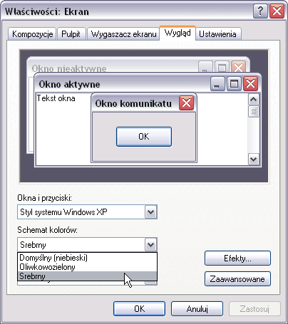 Aby dostosować kompozycję Windows, kliknij Pulpit drugim przyciskiem myszki i wybierz Ekran. Na zakładce Kompozycje znajdziesz Klasyczny Windows i Windows XP z tematem Luna. Ten ostatni oferuje 3 schematy kolorów, które możesz wybrać z zakładki Wygląd: