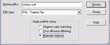 Otwórz bitmapę w programie Paint Shop Pro, następnie użyj specjalnej palety kolorów ZOBACZ.PAL, którą możesz ściągnąć stąd (1 kB).